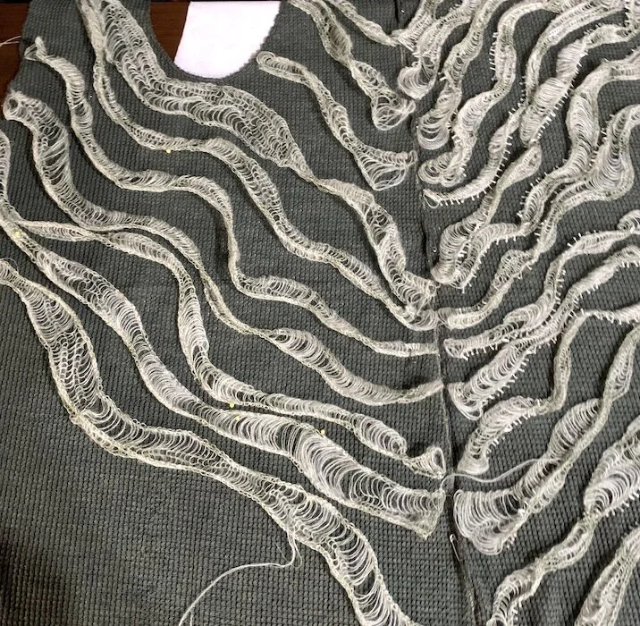 Hand-beaded ruffles awaiting to be attached to body.